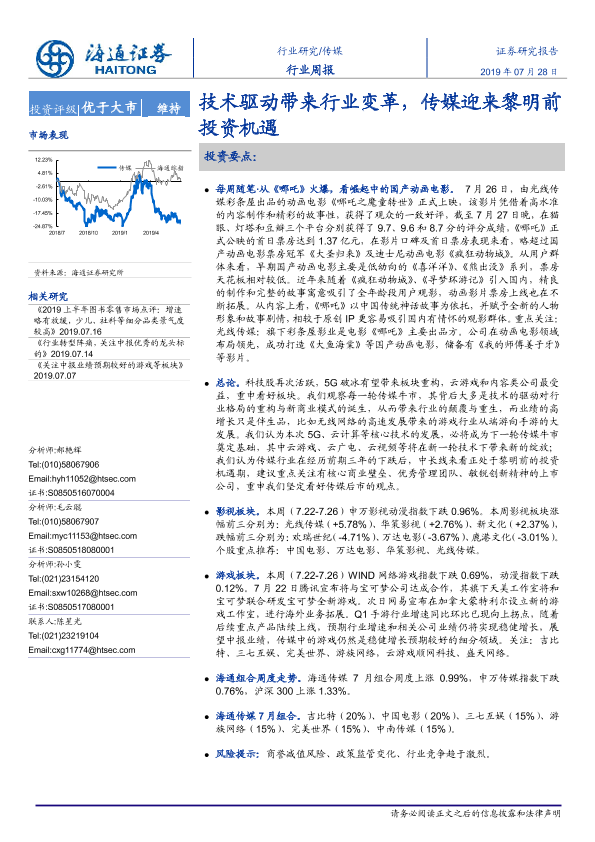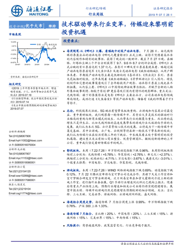 【海通证券】【20190728】20190728-海通证券-传媒行业周报:技术驱动带来行业变革,传媒迎来黎明前投资机遇-9页