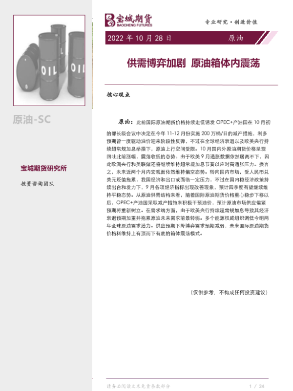 【宝城期货】【20221028】原油月报:供需博弈加剧,原油箱体内震荡-23页