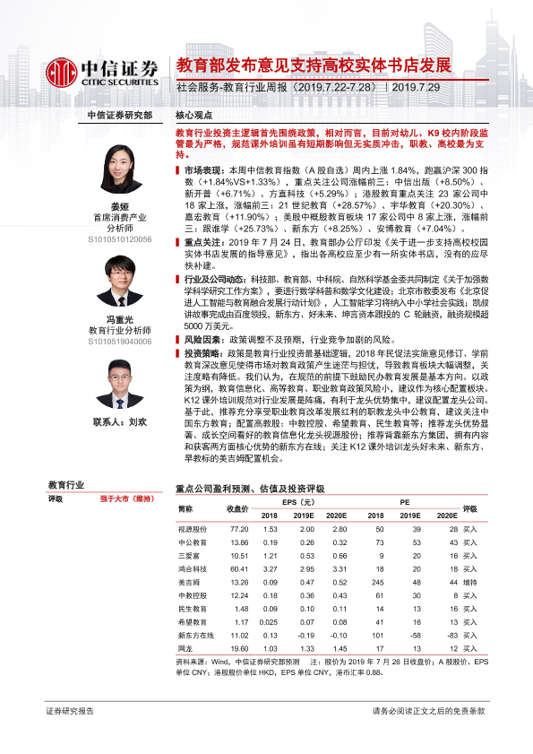 【中信证券】【20190729】社会服务-教育行业周报:教育部发布意见支持高校实体书店发展-10页