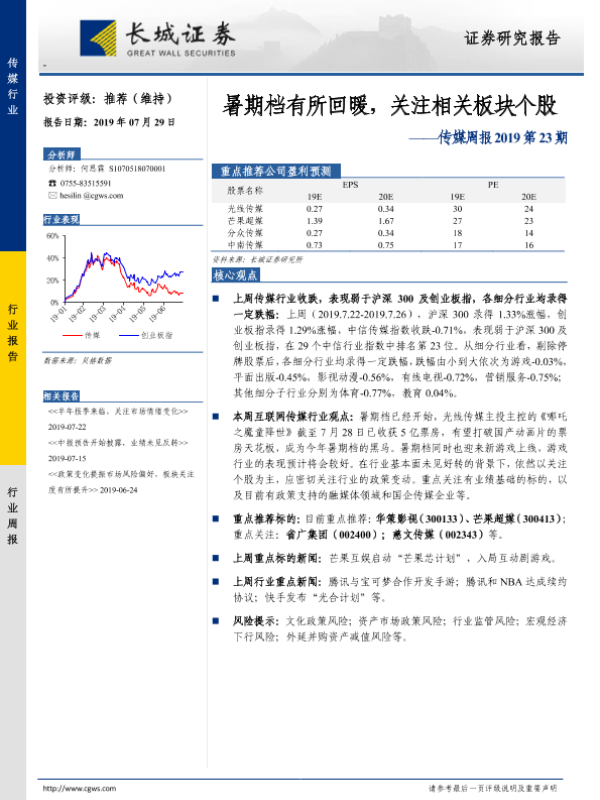 【长城证券】【20190729】20190729-长城证券-传媒周报2019第23期:暑期档有所回暖,关注相关板块个股-13页