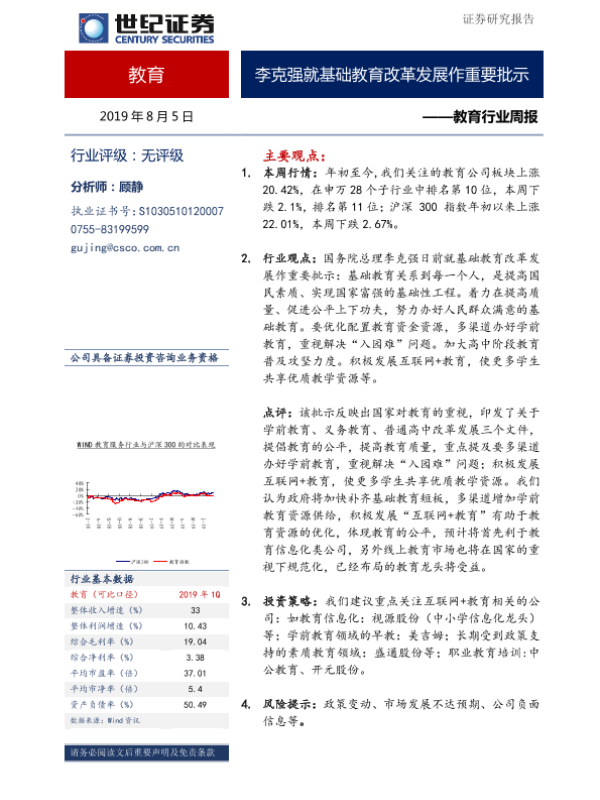【世纪证券】【20190805】20190805-世纪证券-教育行业周报:李克强就基础教育改革发展作重要批示-12页