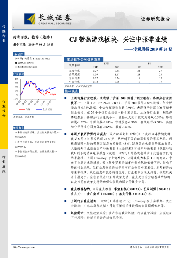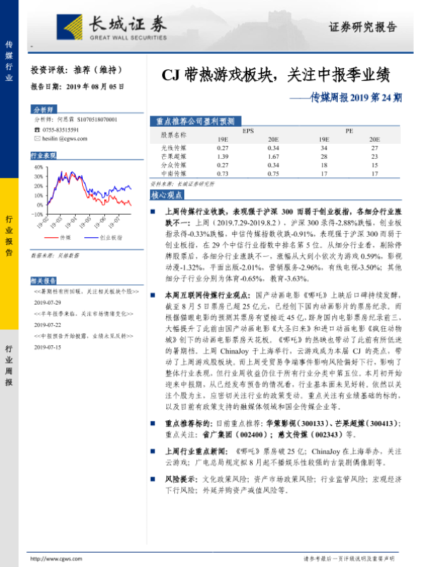 【长城证券】【20190805】20190805-长城证券-传媒周报2019第24期:CJ带热游戏板块,关注中报季业绩-15页