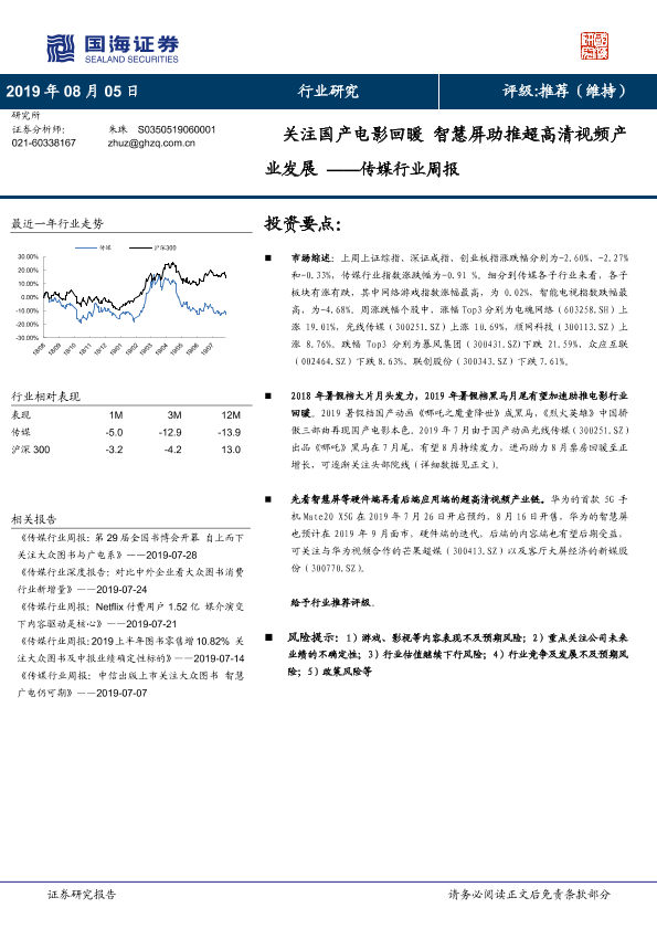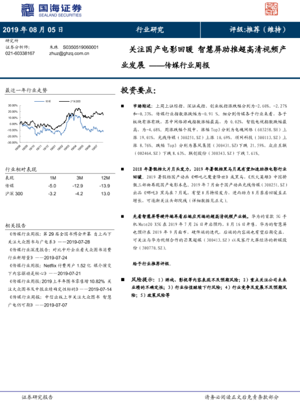 【国海证券】【20190805】传媒行业周报:关注国产电影回暖 智慧屏助推超高清视频产业发展-21页