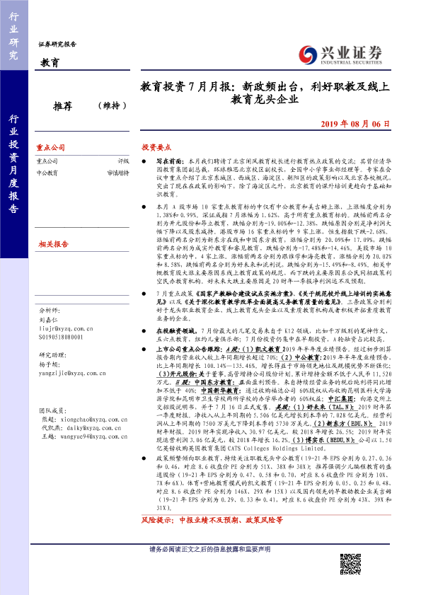 【兴业证券】【20190806】教育投资7月月报:新政频出台,利好职教及线上教育龙头企业-19页