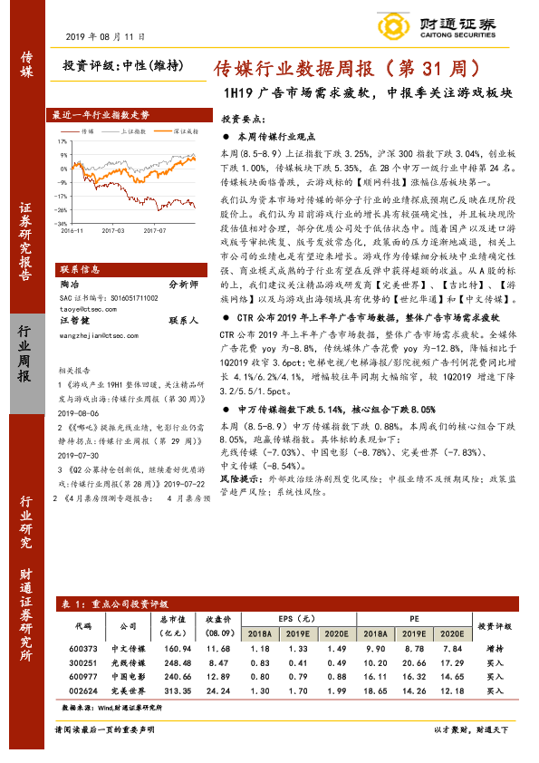 【财通证券】【20190811】20190811-财通证券-传媒行业数据周报(第31周):1H19广告市场需求疲软,中报季关注游戏板块-16页