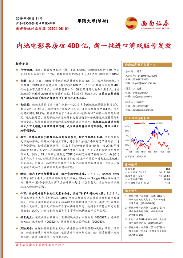 【西南证券】【20190811】影视传媒行业周报:内地电影票房破400亿,新一批进口游戏版号发放-16页