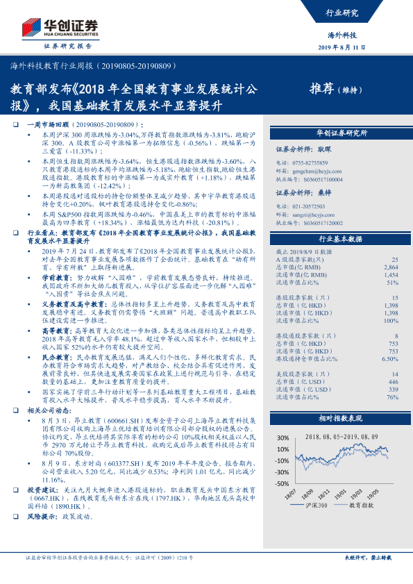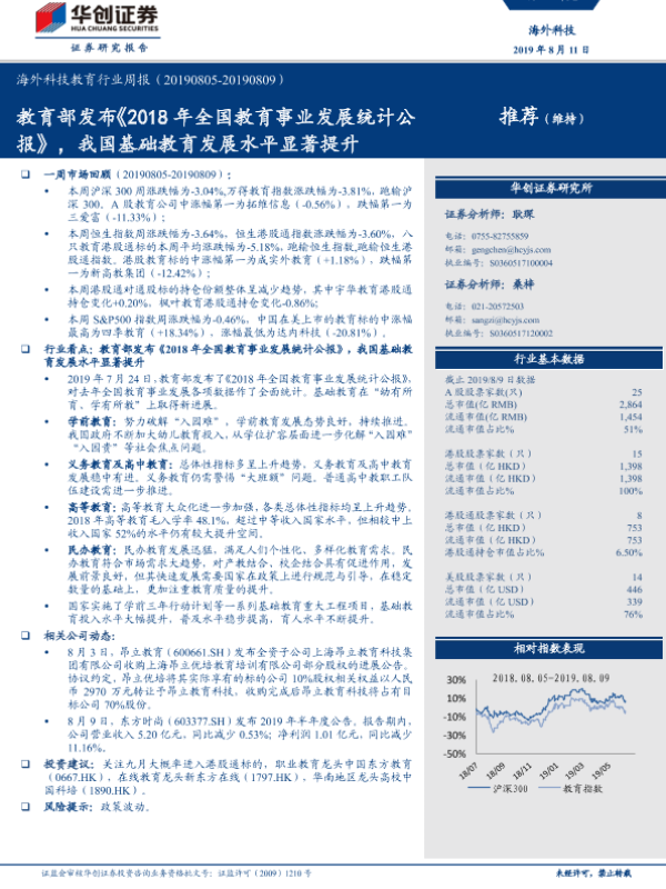【华创证券】【20190811】海外科技教育行业周报:教育部发布《2018年全国教育事业发展统计公报》,我国基础教育发展水平显著提升-13页