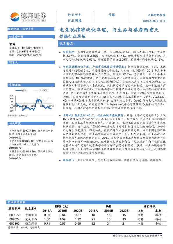 【德邦证券】【20190812】20190812-德邦证券-传媒行业周报:电竞驰骋游戏快车道,衍生品与票房两重天-3页