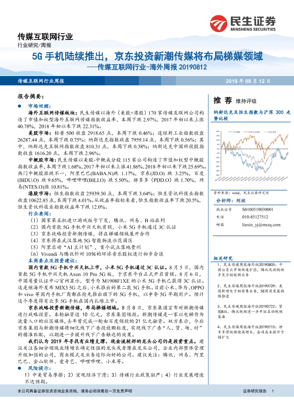 【民生证券】【20190812】20190812-民生证券-传媒互联网行业-海外周报:5G手机陆续推出,京东投资新潮传媒将布局梯媒领域-16页