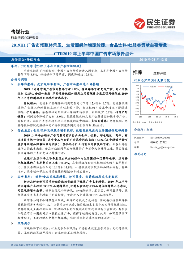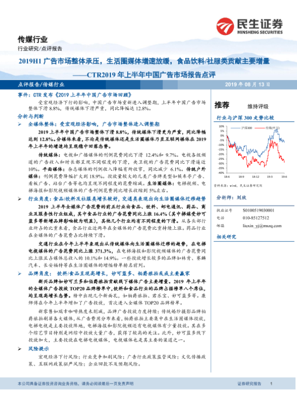 【民生证券】【20190813】2019H1广告市场整体承压,生活圈媒体增速放缓,食品饮料/社服类贡献主要增量-14页