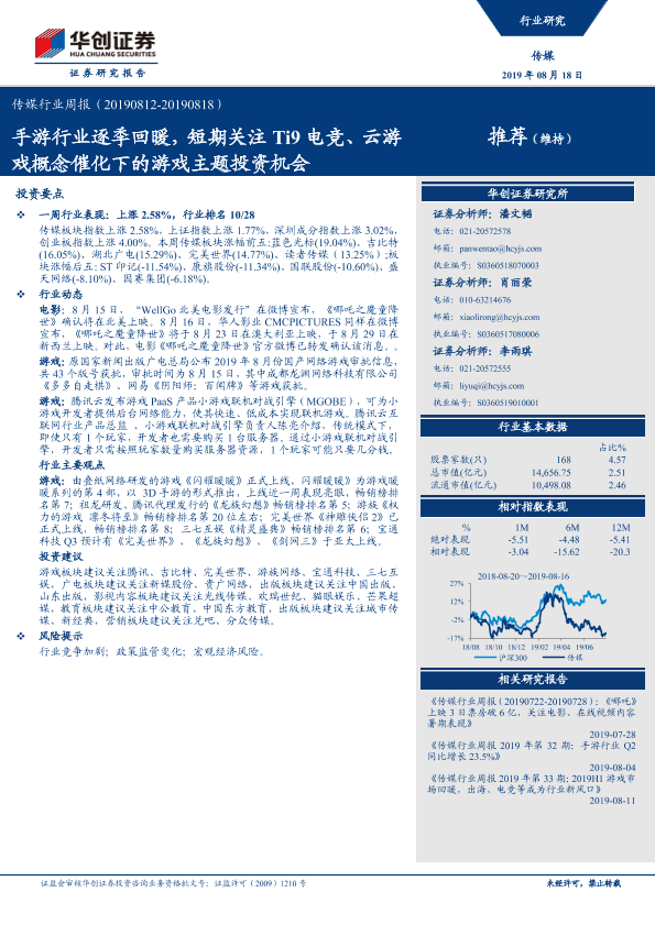 【华创证券】【20190818】20190818-华创证券-传媒行业周报:手游行业逐季回暖,短期关注Ti9电竞、云游戏概念催化下的游戏主题投资机会-15页