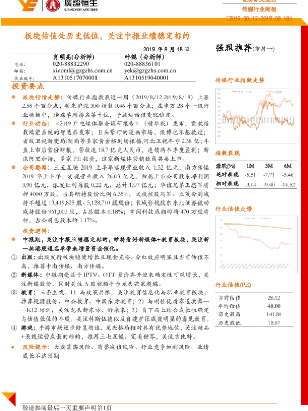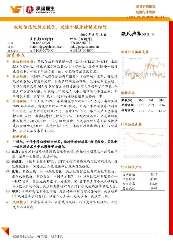 【广证恒生】【20190818】传媒行业周报:板块估值处历史低位,关注中报业绩稳定标的-23页