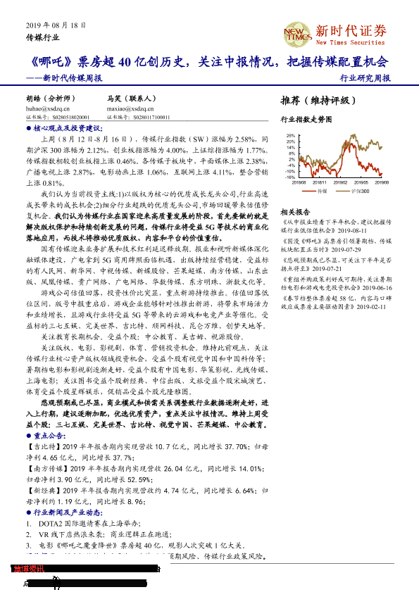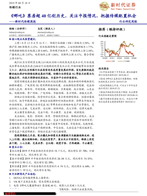 【新时代证券】【20190818】新时代传媒周报:《哪吒》票房超40亿创历史,关注中报情况,把握传媒配置机会-14页