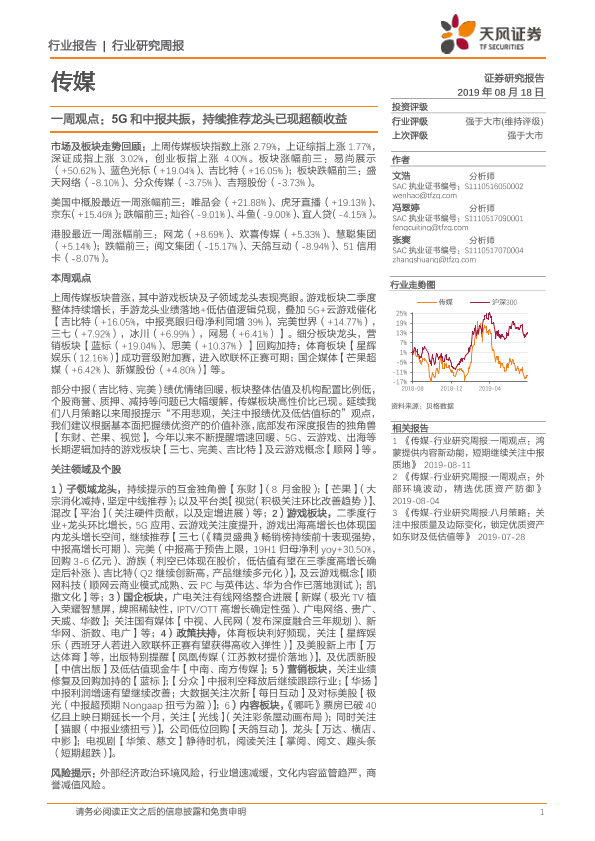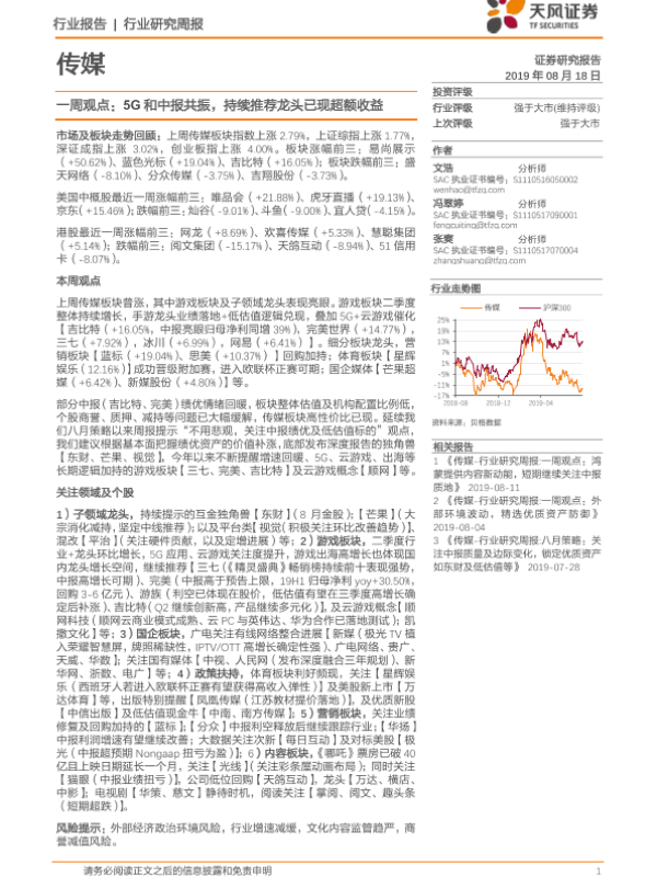 【天风证券】【20190818】传媒一周观点:5G和中报共振,持续推荐龙头已现超额收益-25页