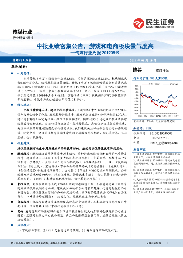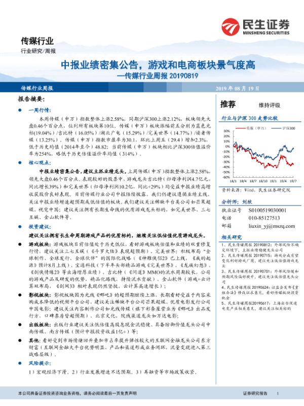 【民生证券】【20190819】20190819-民生证券-传媒行业周报:中报业绩密集公告,游戏和电商板块景气度高-14页