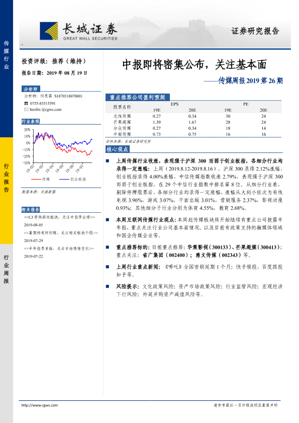 【长城证券】【20190819】20190819-长城证券-传媒周报2019第26期:中报即将密集公布,关注基本面-14页