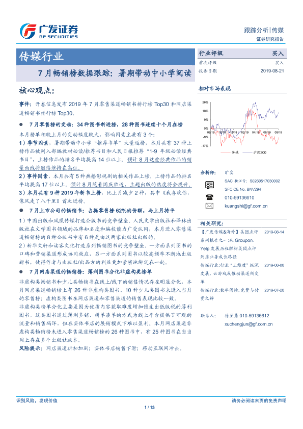 【广发证券】【20190821】传媒行业7月畅销榜数据跟踪:暑期带动中小学阅读-13页