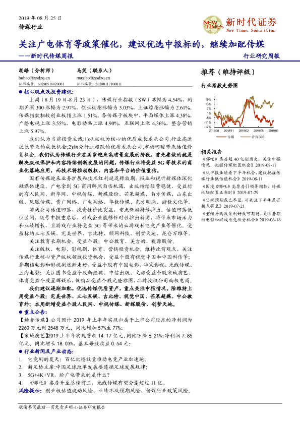 【新时代证券】【20190825】新时代传媒周报:关注广电体育等政策催化,建议优选中报标的,继续加配传媒-14页