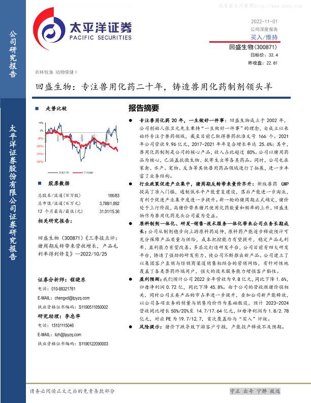 【太平洋证券】【20221101】回盛生物:专注兽用化药二十年,铸造兽用化药制剂领头羊-29页