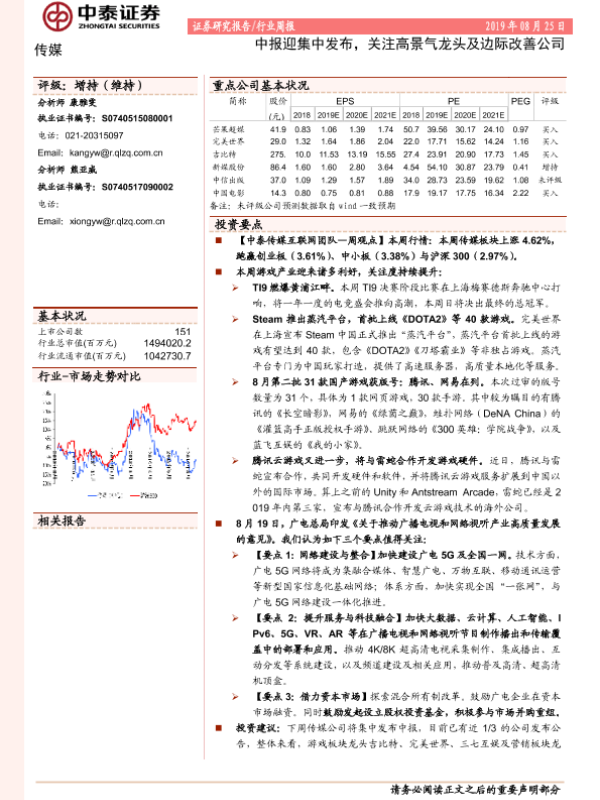 【中泰证券】【20190825】20190825-中泰证券-传媒行业周报:中报迎集中发布,关注高景气龙头及边际改善公司-11页