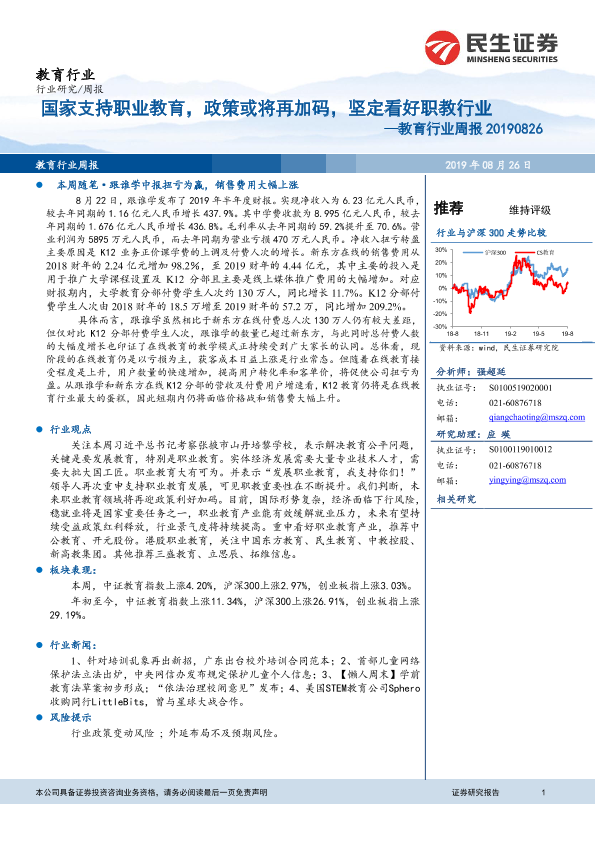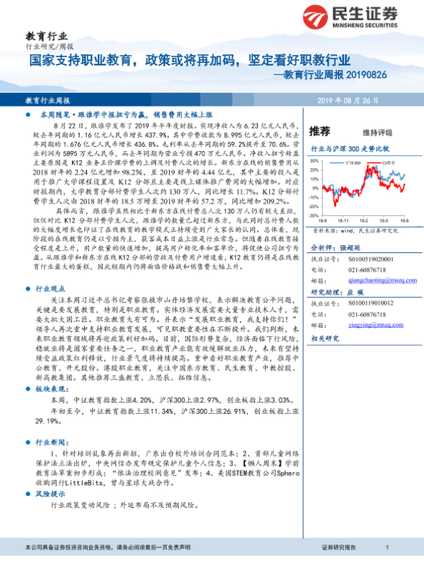 【民生证券】【20190826】教育行业周报:国家支持职业教育,政策或将再加码,坚定看好职教行业-13页