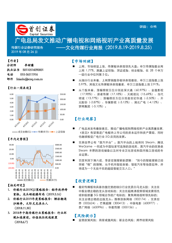 【首创证券】【20190826】20190826-首创证券-文化传媒行业周报:广电总局发文推动广播电视和网络视听产业高质量发展-16页