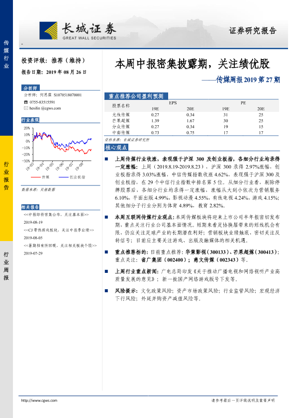 【长城证券】【20190826】20190826-长城证券-传媒周报2019第27期:本周中报密集披露期,关注绩优股-16页