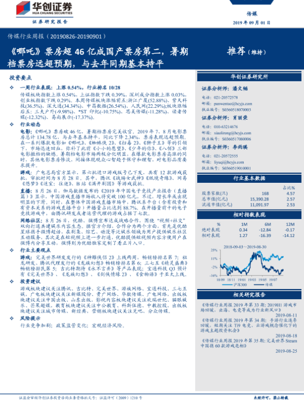 【华创证券】【20190901】20190901-华创证券-传媒行业周报:《哪吒》票房超46亿成国产票房第二,暑期档票房远超预期,与去年同期基本持平-14页