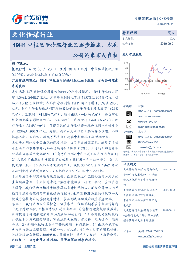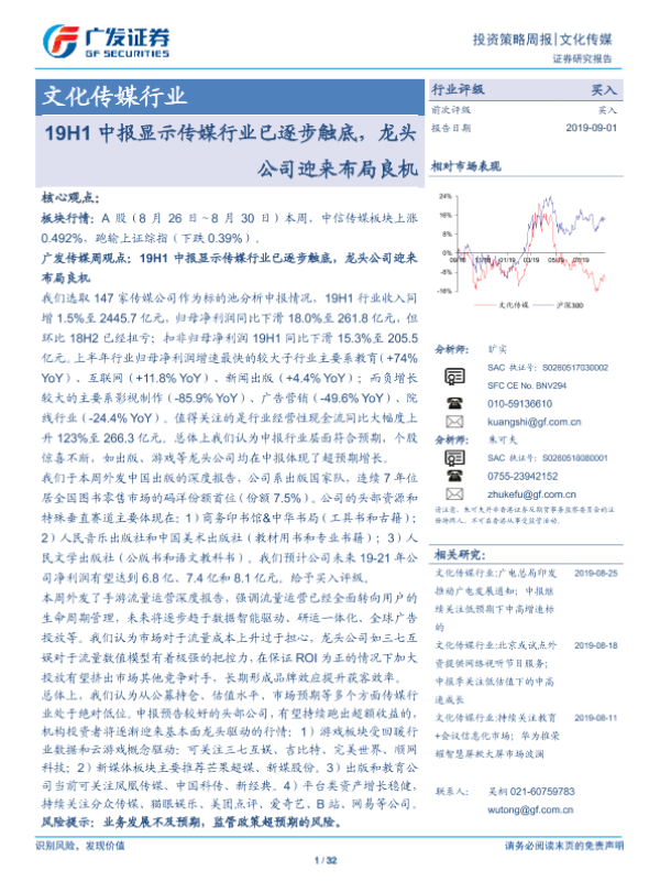 【广发证券】【20190901】20190901-广发证券-文化传媒行业投资策略周报:19H1中报显示传媒行业已逐步触底,龙头公司迎来布局良机-32页