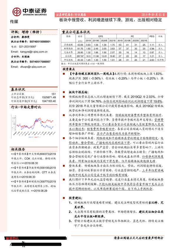 【中泰证券】【20190901】20190901-中泰证券-传媒行业周报:板块中报营收、利润增速继续下滑,游戏、出版相对稳定-12页