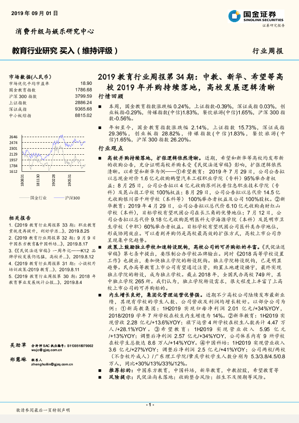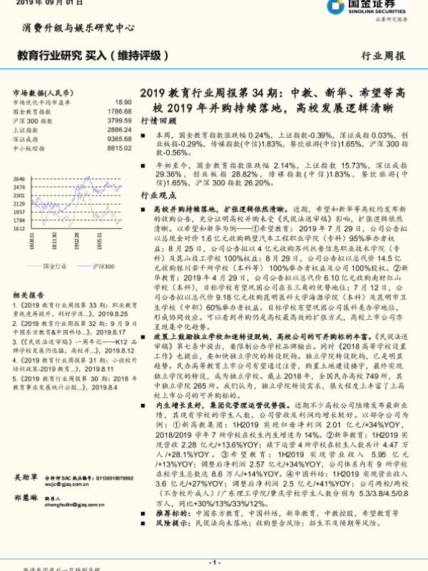 【国金证券】【20190901】2019教育行业周报第34期:中教、新华、希望等高校2019年并购持续落地,高校发展逻辑清晰-16页