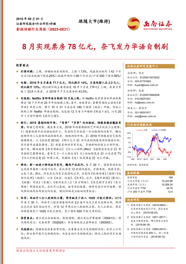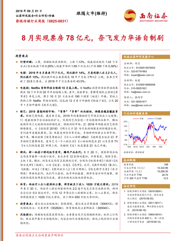 【西南证券】【20190901】影视传媒行业周报:8月实现票房78亿元,奈飞发力华语自制剧-16页