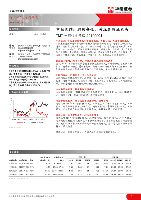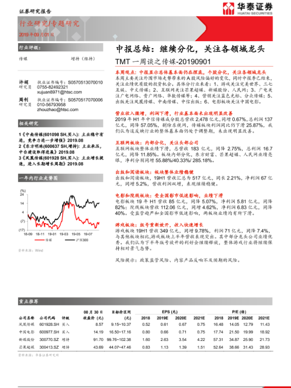 【华泰证券】【20190901】TMT一周谈之传媒-中报总结:继续分化,关注各领域龙头-14页