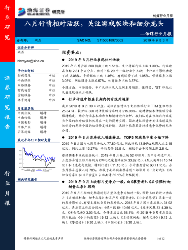 【渤海证券】【20190902】20190902-渤海证券-传媒行业月报:八月行情相对活跃,关注游戏版块和细分龙头-12页