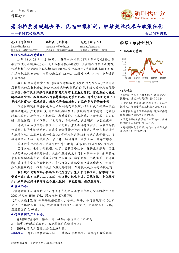 【新时代证券】【20190901】20190901-新时代证券-传媒周报:暑期档票房超越去年,优选中报标的,继续关注技术和政策催化-16页