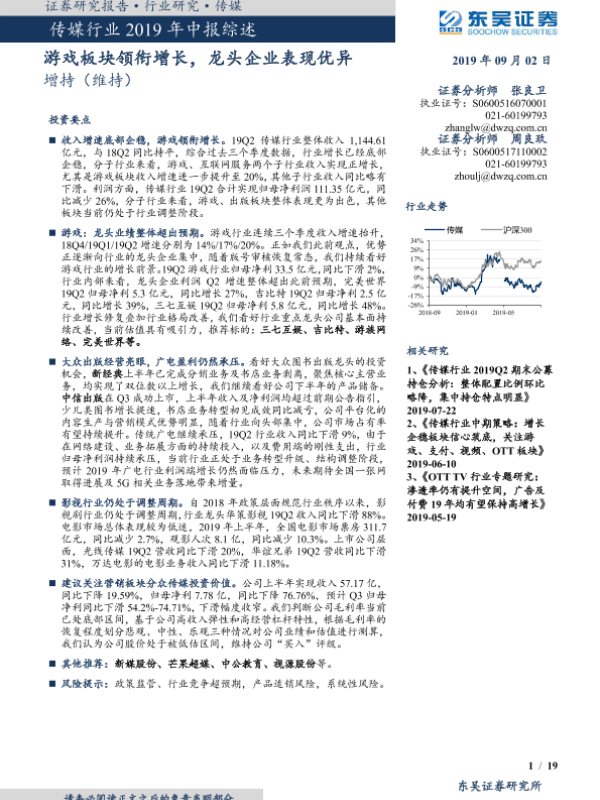 【东吴证券】【20190902】传媒行业2019年中报综述:游戏板块领衔增长,龙头企业表现优异-19页