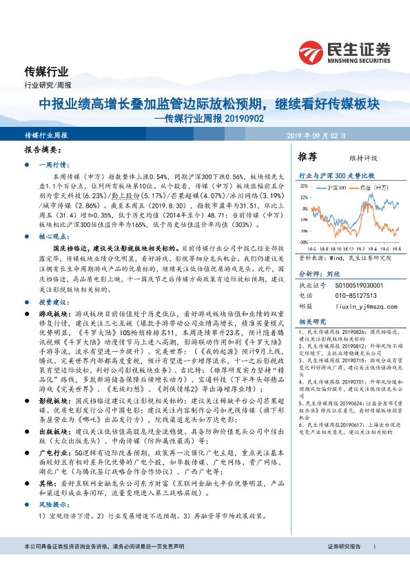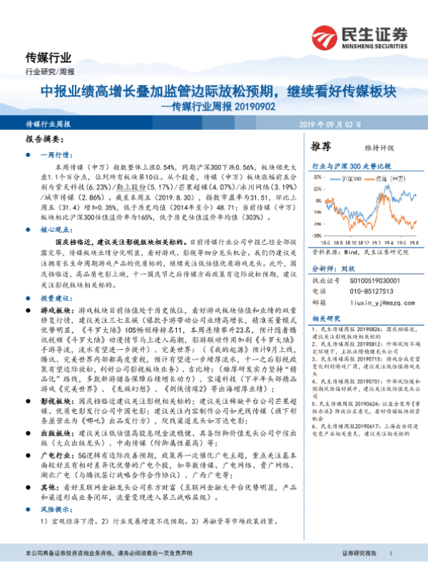 【民生证券】【20190902】20190902-民生证券-传媒行业周报:中报业绩高增长叠加监管边际放松预期,继续看好传媒板块-13页