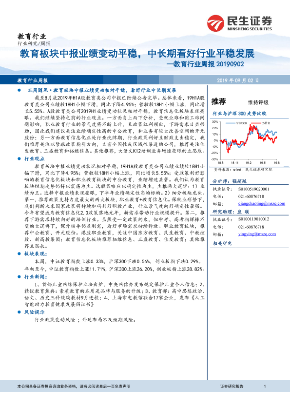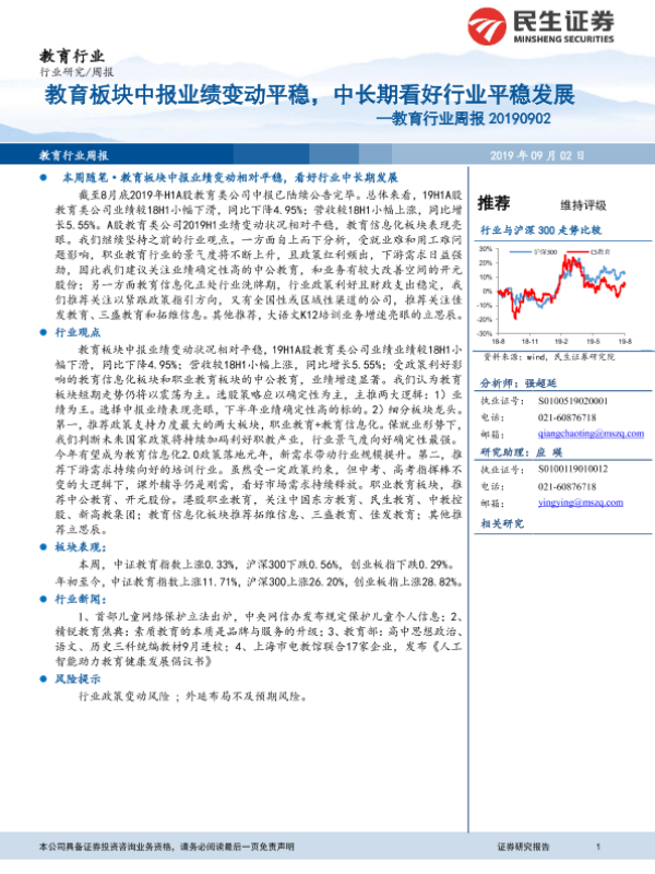 【民生证券】【20190902】教育行业周报:教育板块中报业绩变动平稳,中长期看好行业平稳发展-12页