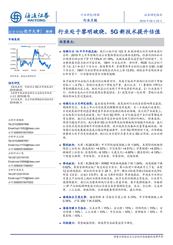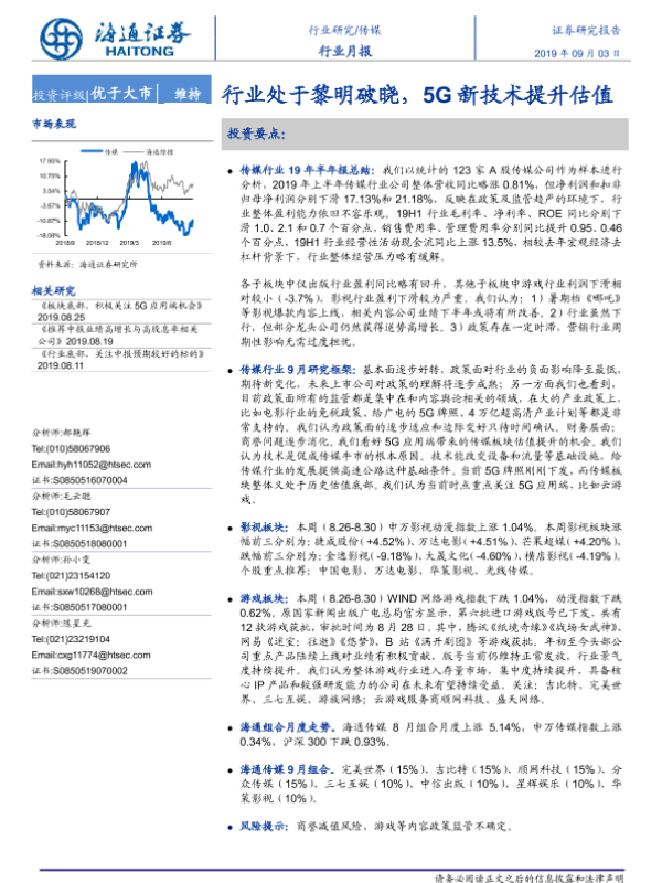 【海通证券】【20190903】传媒行业月报:行业处于黎明破晓,5G新技术提升估值-12页
