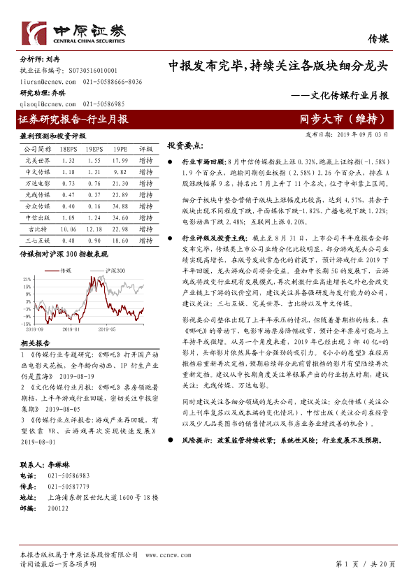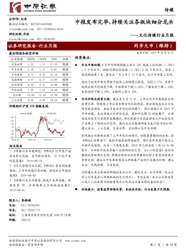 【中原证券】【20190903】20190903-中原证券-文化传媒行业月报:中报发布完毕,持续关注各版块细分龙头-20页
