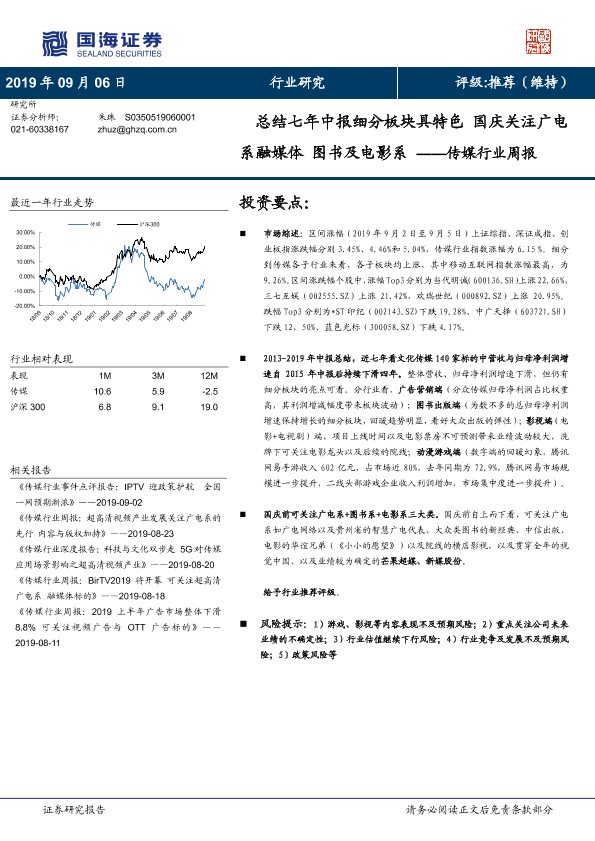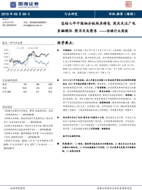 【国海证券】【20190906】20190906-国海证券-传媒行业周报:总结七年中报细分板块具特色 国庆关注广电系融媒体 图书及电影系-21页