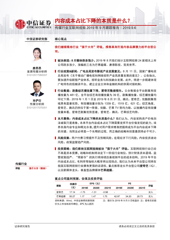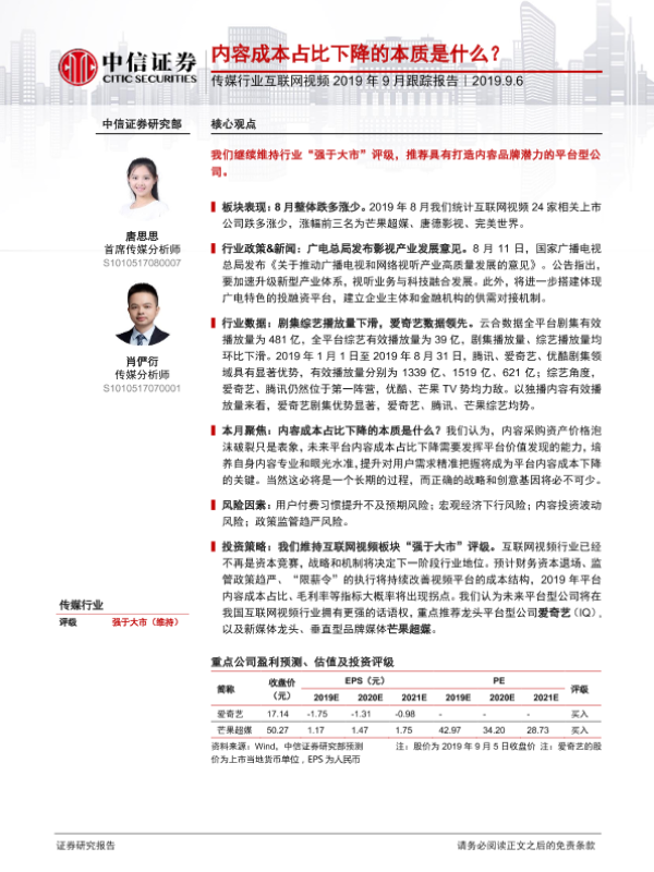 【中信证券】【20190906】传媒行业互联网视频2019年9月跟踪报告:内容成本占比下降的本质是什么?-11页