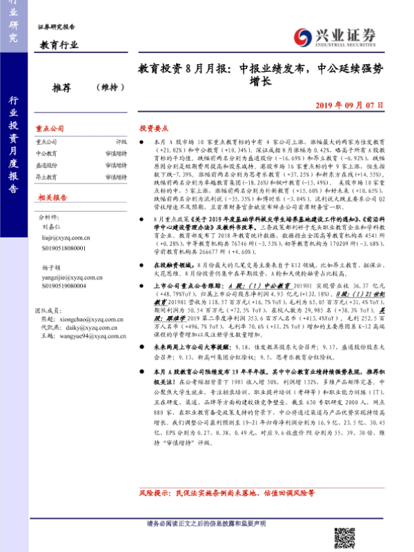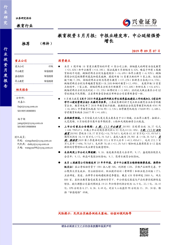 【兴业证券】【20190907】教育投资8月报:中报业绩发布,中公延续强势增长-18页