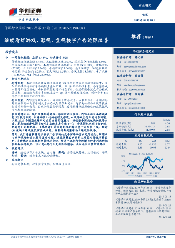【华创证券】【20190908】传媒行业周报2019年第37期:继续看好游戏、影视,重视楼宇广告边际改善-14页