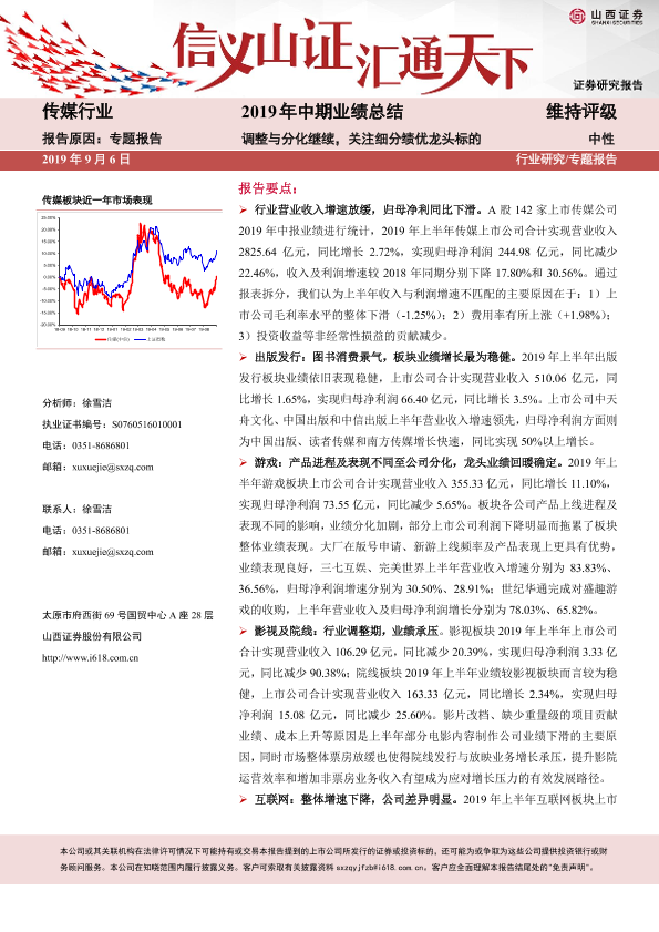 【山西证券】【20190906】传媒行业2019年中期业绩总结:调整与分化继续,关注细分绩优龙头标的-22页