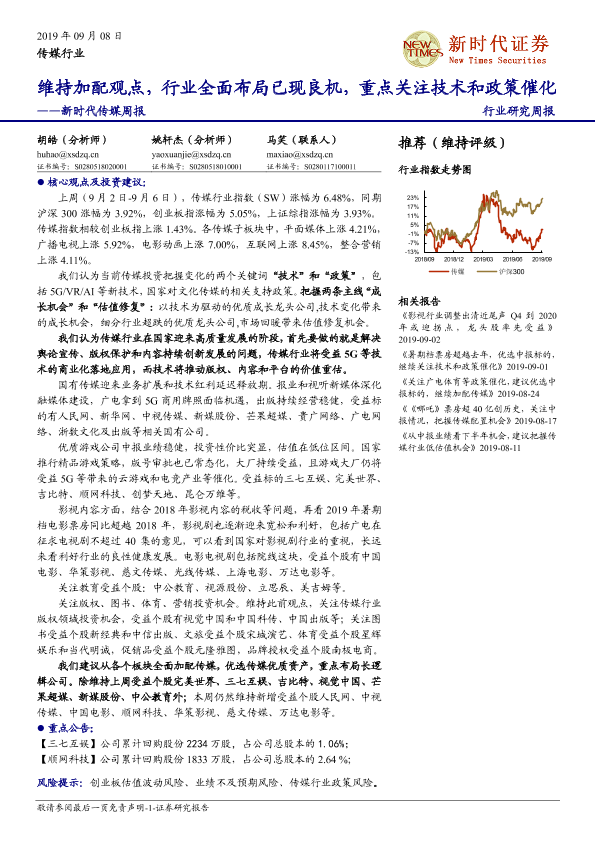 【新时代证券】【20190908】新时代传媒周报:维持加配观点,行业全面布局已现良机,重点关注技术和政策催化-13页