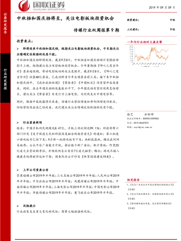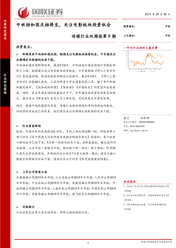 【国联证券】【20190909】传媒行业双周报第9期:中秋档和国庆档将至,关注电影板块投资机会-9页