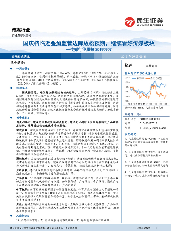 【民生证券】【20190909】20190909-民生证券-传媒行业周报:国庆档临近叠加监管边际放松预期,继续看好传媒板块-16页