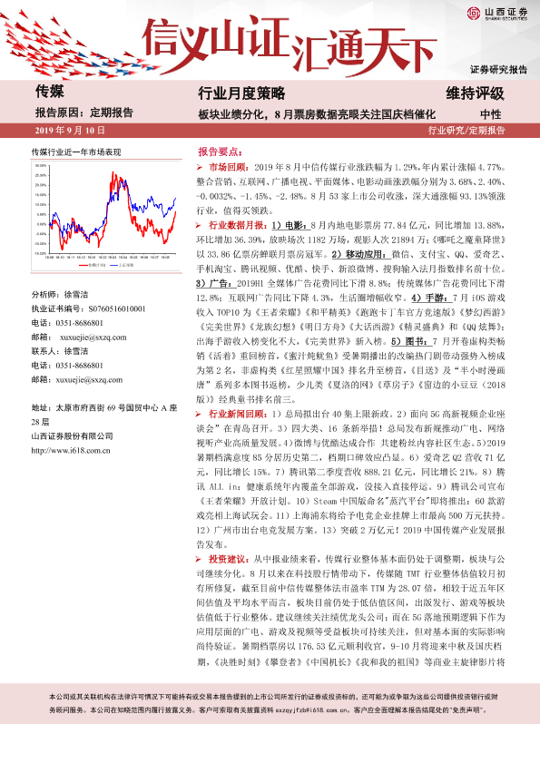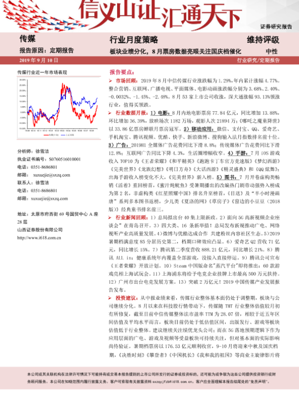 【山西证券】【20190910】20190910-山西证券-传媒行业月度策略:板块业绩分化,8月票房数据亮眼关注国庆档催化-23页