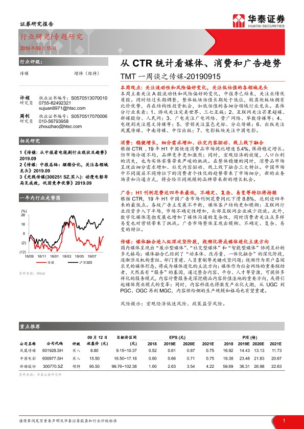 【华泰证券】【20190915】20190915-华泰证券-TMT一周谈之传媒:从CTR统计看媒体、消费和广告趋势-13页